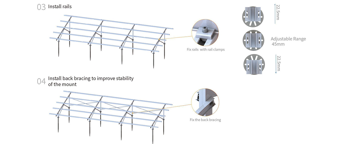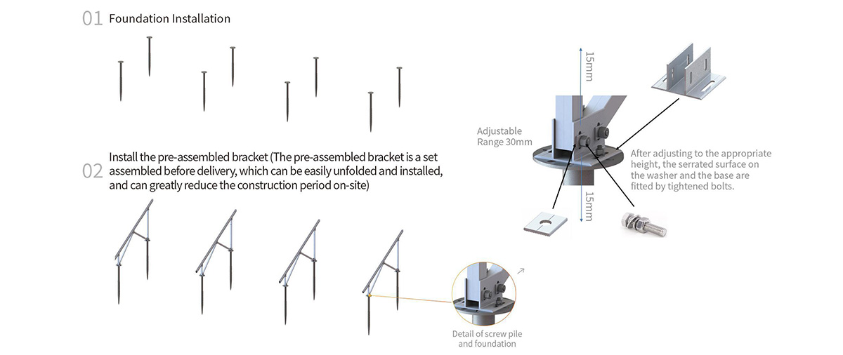 The beams and supports will be pre-assembled on the factory before delivery, to save working time on site. The special base plate design ensures adjustable range on height and front-back direction, to adapt installation site.
