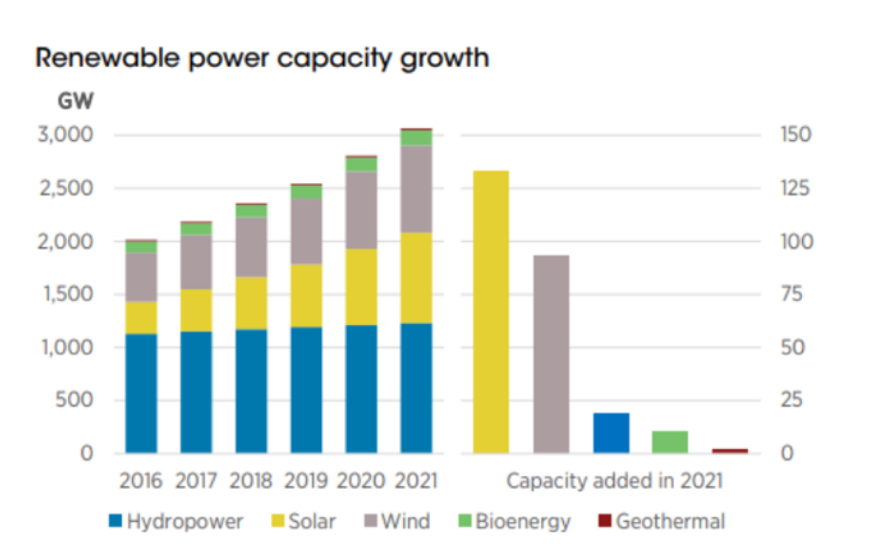 El último "Informe de estadísticas de generación de energía renovable 2022" publicado por la Agencia Internacional de Energías Renovables (IRENA) muestra que en 2021, la capacidad instalada global recién agregada de energía renovable alcanzó los 257 gigavatios (GW), un aumento del 9,1% interanual, lo que llevó la capacidad instalada acumulada global de energía renovable a superar los 3TW (3.064 GW).