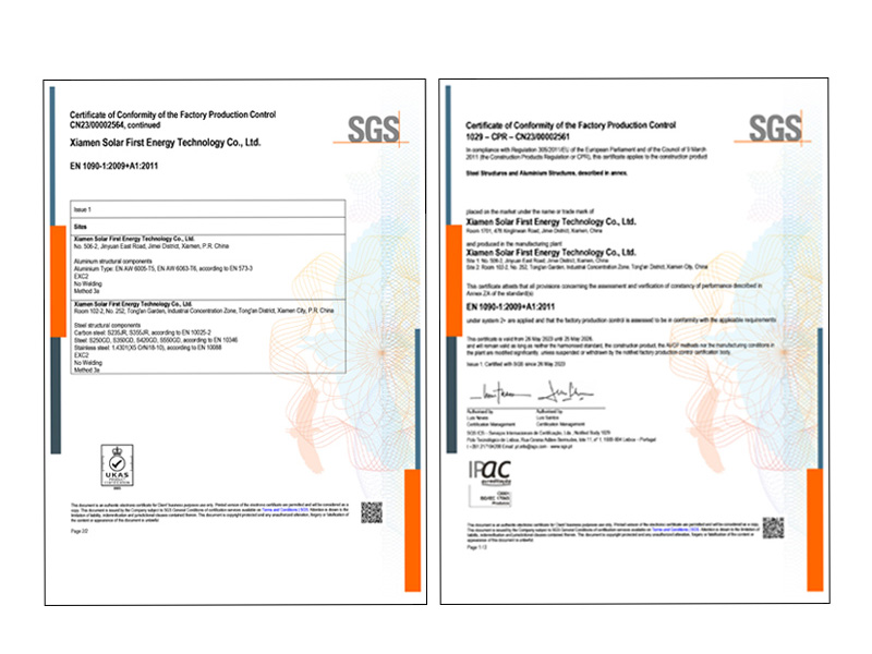 Esta certificación se aplica a Estructuras de acero y estructuras de aluminio comercializado bajo la Xiamen Solar First Energy Technology Co., Ltd. marca, fabricada en las instalaciones de producción de la empresa.
