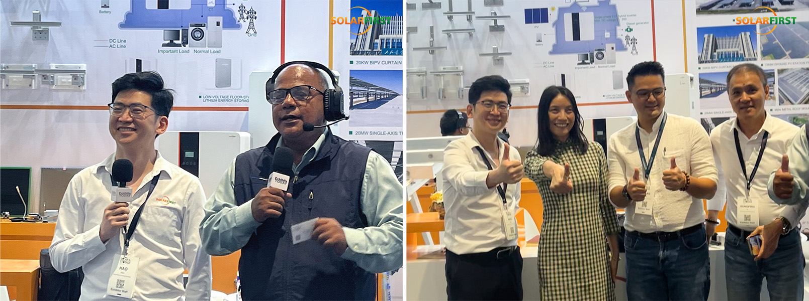 El día de la inauguración, Solar First atrajo un gran interés gracias a sus productos fotovoltaicos de última generación y su consolidada reputación en el mercado. El director de marketing, Dennis, ofreció presentaciones detalladas sobre sistemas de montaje en suelo y soluciones fotovoltaicas flotantes, mostrando aplicaciones específicas para cada escenario que mejoran la eficiencia de la conversión energética, reducen costes y maximizan el retorno de la inversión.