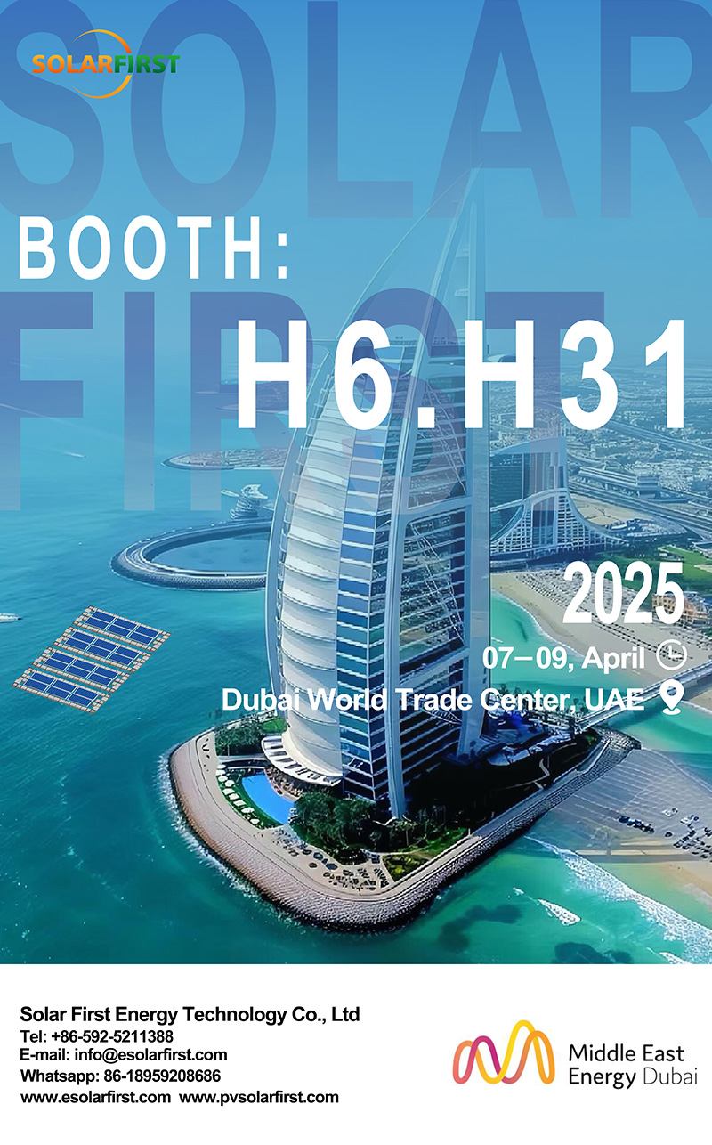 Solar First Energy Technology Co., Ltd. invita cordialmente a sus socios de la industria a explorar tecnologías renovables de vanguardia en Middle East Energy 2025 (del 7 al 9 de abril, en el Centro de Comercio Mundial de Dubái). Visítenos en el stand H6.H31 para hablar sobre los avances en energía sostenible.