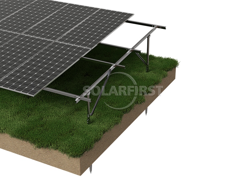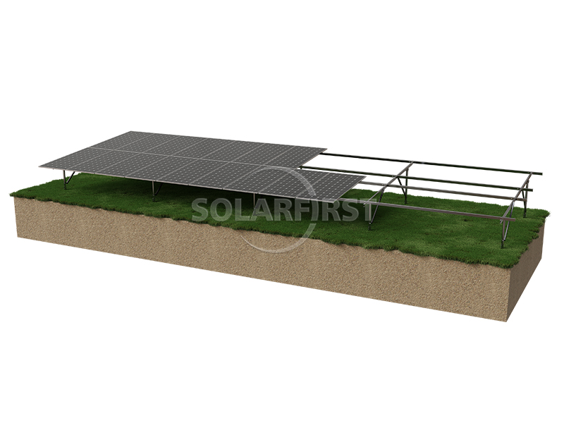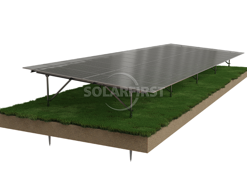 Solar First's ground-mounted solar system is an east-west adjustable, pre-assembled bracket solution designed for large commercial and utility ground-mounted solar installations. It utilizes a durable helical pile foundation, ensuring rapid deployment, robust structural support, and long-term corrosion resistance.