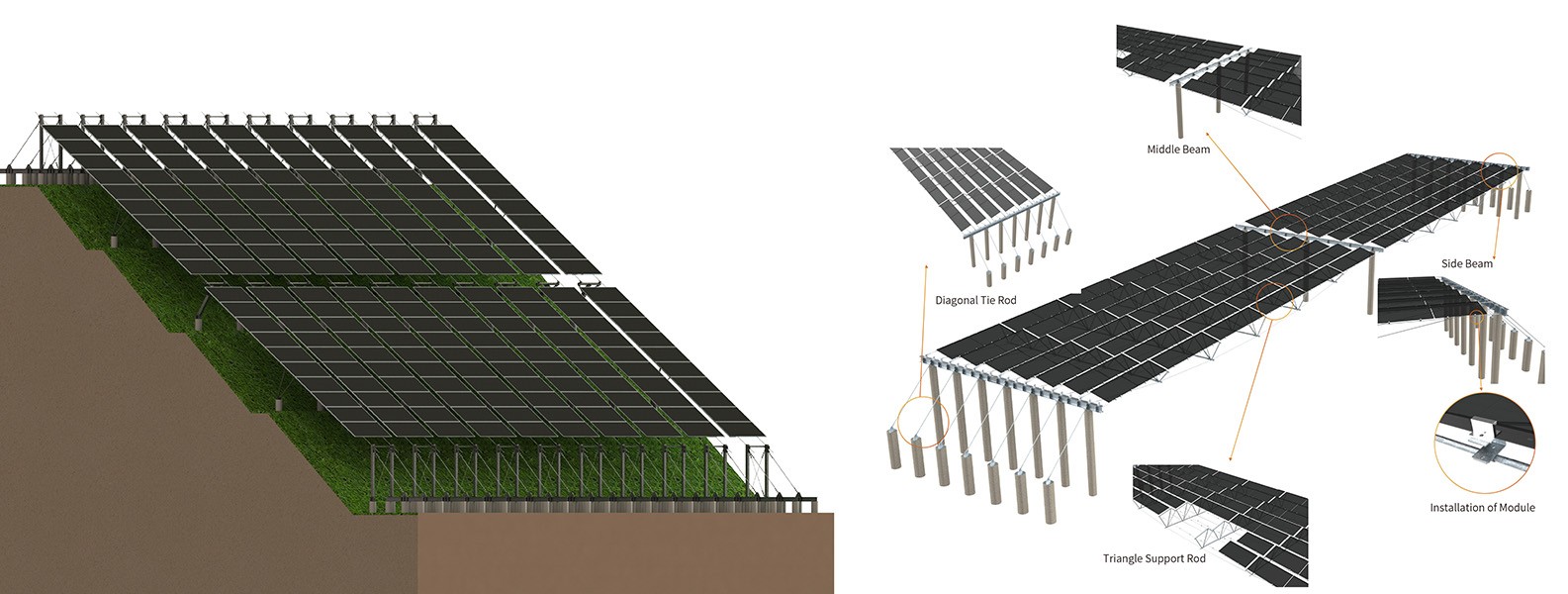 El sistema de soporte flexible de cable de doble capa alcanza una distancia de ≤50 metros mediante una estructura de red de cables, lo que crea una distancia de operación de ≤6 metros. En comparación con los soportes fijos, reduce el uso de cimentación con pilotes en un 55 % y es ideal para escenarios como plantas de tratamiento de aguas residuales, complementariedad fotovoltaica agrícola y complementaria fotovoltaica pesquera, además de cumplir con el Código de Diseño de Estructuras de Acero GB50017-2017.
