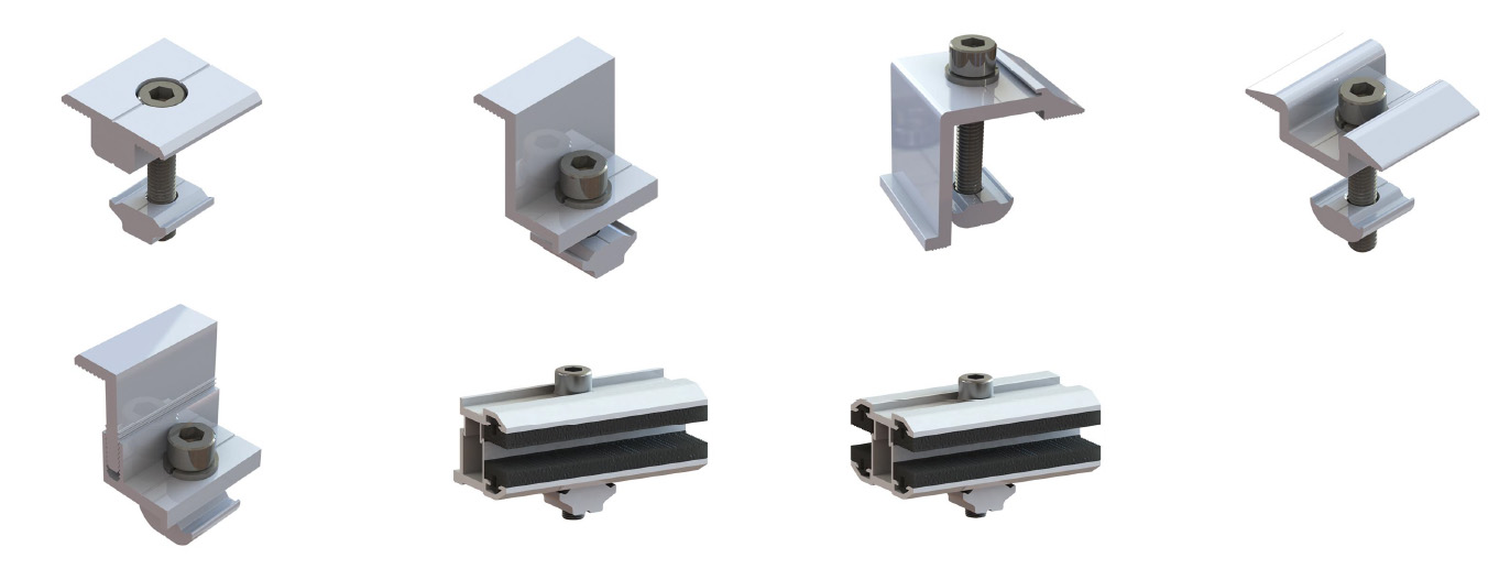 Las abrazaderas están disponibles en múltiples diseños, incluyendo opciones de apriete con uno o dos pernos, lo que agiliza la instalación y ahorra tiempo. Compatibles con diseños de paneles tanto longitudinales como transversales, se adaptan a diversos perfiles de techos metálicos, como juntas laminadas simples o dobles, y son compatibles con la mayoría de los módulos solares. Componentes adicionales como patas en L, patas fijas o abrazaderas para módulos permiten una integración flexible y rápida con sistemas de rieles completos.