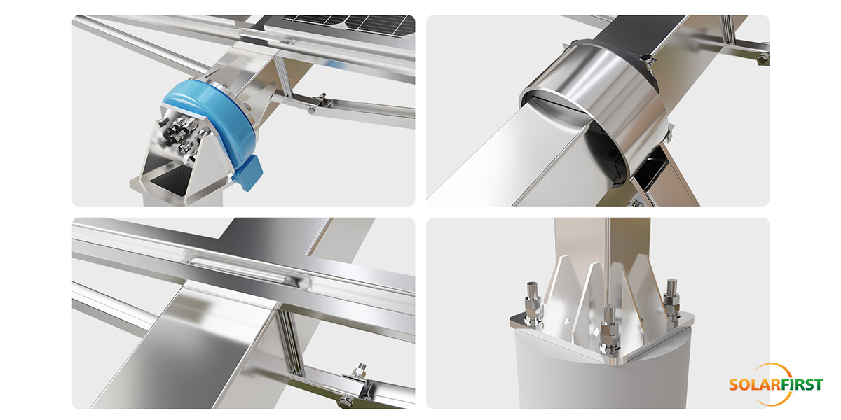 Fabricado en acero galvanizado por inmersión en caliente o con recubrimiento de Zn-Al-Mg, con un espesor medio de recubrimiento ≥80 μm, el sistema ofrece una excepcional resistencia a la corrosión y una larga durabilidad. Se adapta a diversos tipos de cimentación (PHC, hormigonado in situ o pilotes de acero), lo que permite una instalación flexible en diversos emplazamientos. Con un diseño personalizable que soporta velocidades de viento de hasta 40 m/s, este seguidor combina funcionalidad inteligente con una gran fiabilidad para proyectos solares comerciales y de servicios públicos.